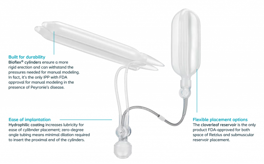 هما القلب النابض للنظام—أسطوانتان ناعمتان ومرنتان مصنوعتان من مادة السيليكون الطبي عالي الجودة (Bioflex). تُزرع هاتان الأسطوانتان داخل الحجرتين الانتصابيتين الطبيعيتين في القضيب (الجسمان الكهفيان)، وهما نفس المكان الذي كان يمتلئ بالدم أثناء الانتصاب الطبيعي.